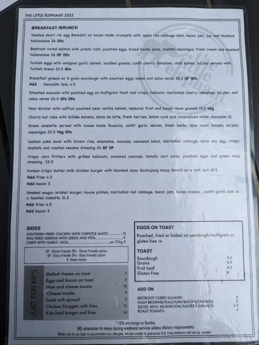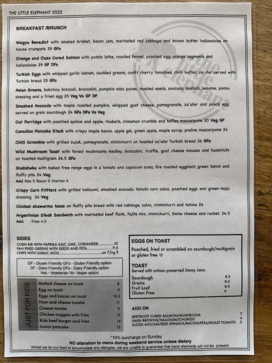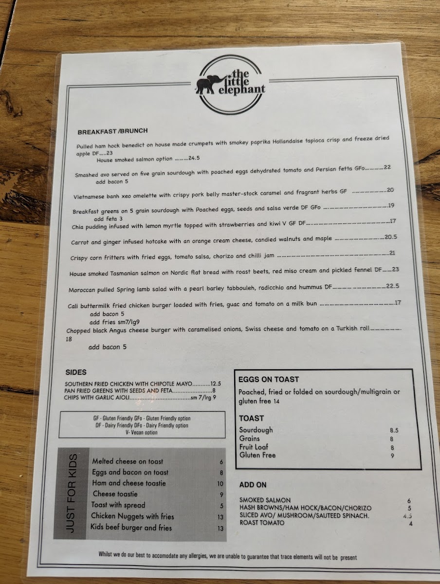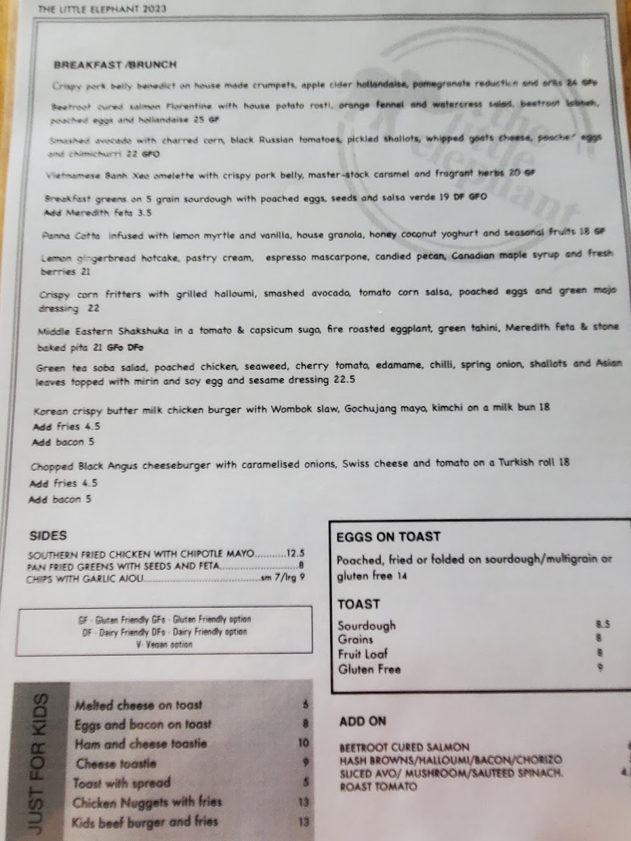 The menu at The Little Elephant offers a delightful range of dishes that cater to all tastes, making it a perfect spot for breakfast or brunch. Start your day with their hearty Turkish Eggs or indulge in the light and refreshing Asian Greens. For something creamy and satisfying, the Smashed Avocado Bircher is a great choice, while the indulgent Canadian Pancake Stack adds a sweet touch to the menu. If you're looking for sides to complement your meal, options like Southern Fried Chicken with Chipotle Mayo and Corn Ribs with Paprika Salt, Lime, and Coriander provide bold flavors. The classic Eggs on Toast is available in poached, fried, or scrambled versions, served on sourdough, multigrain, or gluten-free bread. Toast varieties include Sourdough, Grains, Fruit Loaf, and Gluten Free, all paired with artisan preserved Jimmy Jams. The kids' menu features simple, yet delicious options such as Melted Cheese on Toast and Eggs and Bacon on Toast, sure to please younger guests. For those looking to personalize their dish, there are plenty of add-ons, including Beetroot Cured Salmon, Mushroom, Hash Browns, Halloumi, and more. Whether you're after something light or hearty, The Little Elephant's diverse menu ensures there's something for everyone.