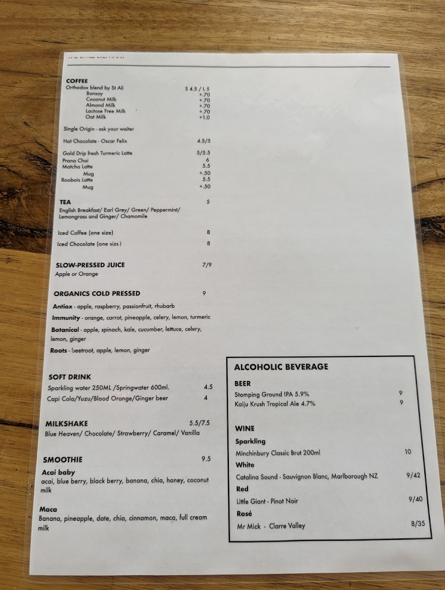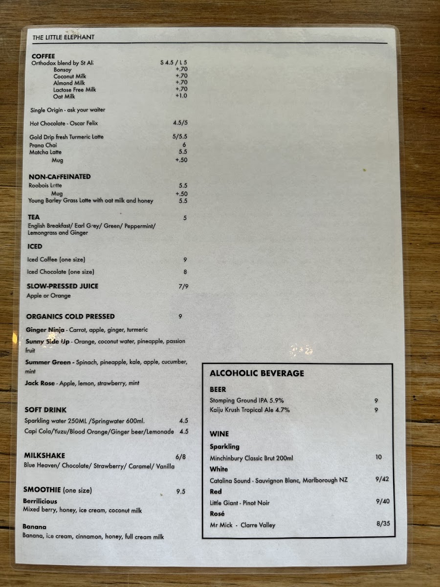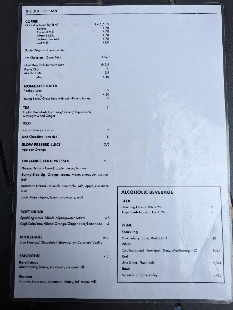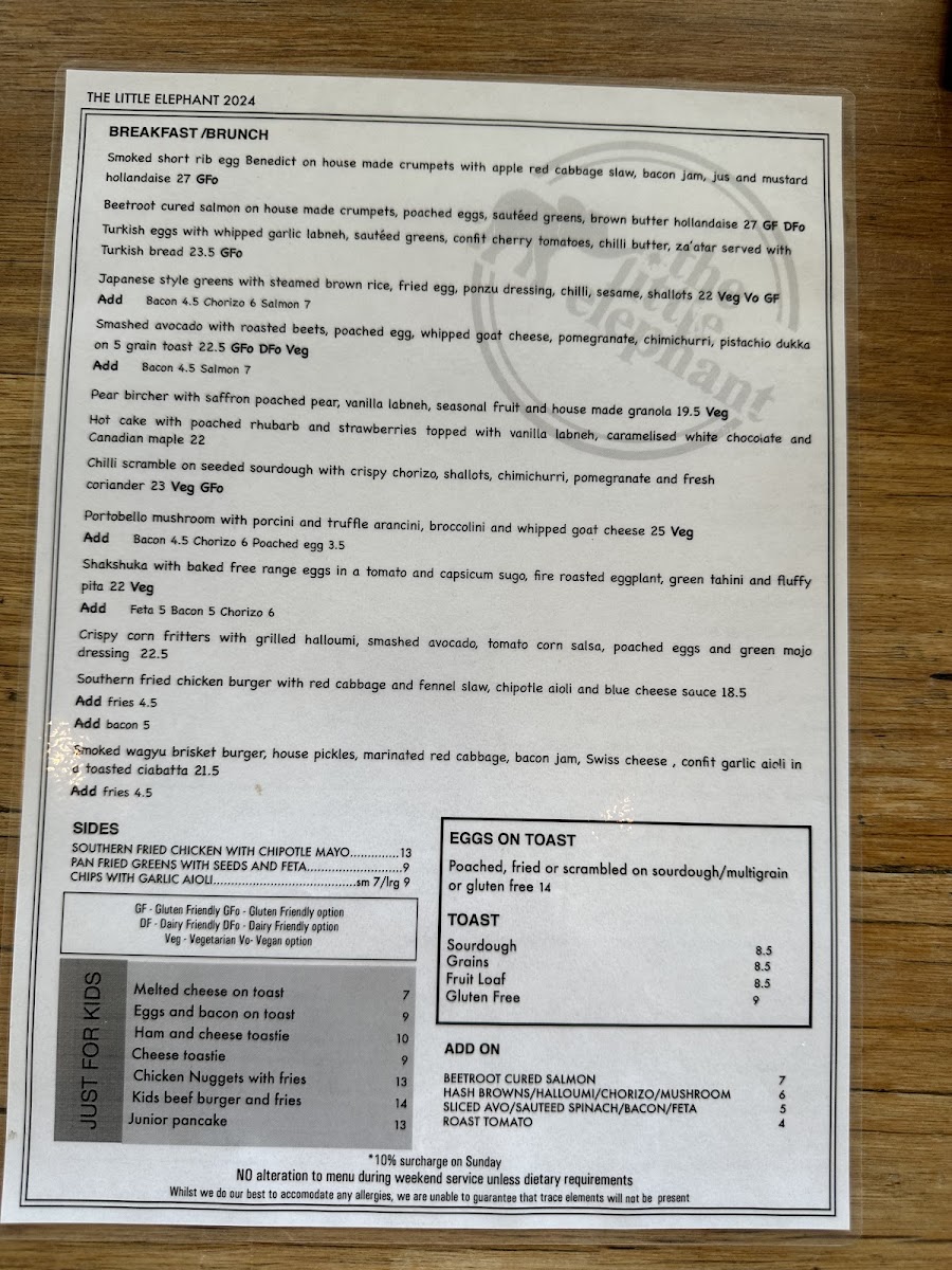The menu at The Little Elephant offers a delightful range of dishes that cater to all tastes, making it a perfect spot for breakfast or brunch. Start your day with their hearty Turkish Eggs or indulge in the light and refreshing Asian Greens. For something creamy and satisfying, the Smashed Avocado Bircher is a great choice, while the indulgent Canadian Pancake Stack adds a sweet touch to the menu. If you're looking for sides to complement your meal, options like Southern Fried Chicken with Chipotle Mayo and Corn Ribs with Paprika Salt, Lime, and Coriander provide bold flavors. The classic Eggs on Toast is available in poached, fried, or scrambled versions, served on sourdough, multigrain, or gluten-free bread. Toast varieties include Sourdough, Grains, Fruit Loaf, and Gluten Free, all paired with artisan preserved Jimmy Jams. The kids' menu features simple, yet delicious options such as Melted Cheese on Toast and Eggs and Bacon on Toast, sure to please younger guests. For those looking to personalize their dish, there are plenty of add-ons, including Beetroot Cured Salmon, Mushroom, Hash Browns, Halloumi, and more. Whether you're after something light or hearty, The Little Elephant's diverse menu ensures there's something for everyone.